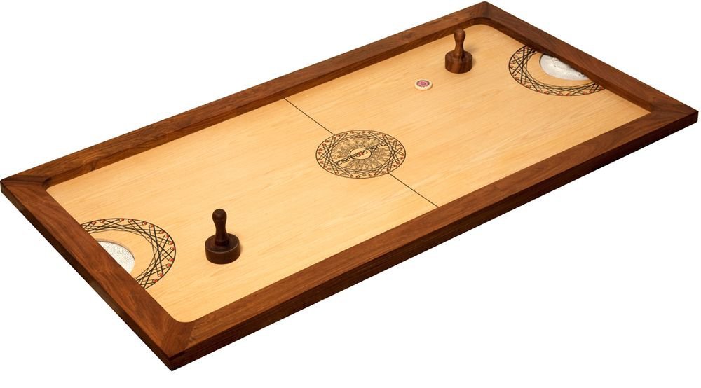 Débarrassez-vous de vos palets plus rapidement que votre adversaire en les faisant passer par le trou grâce à l’élastique.